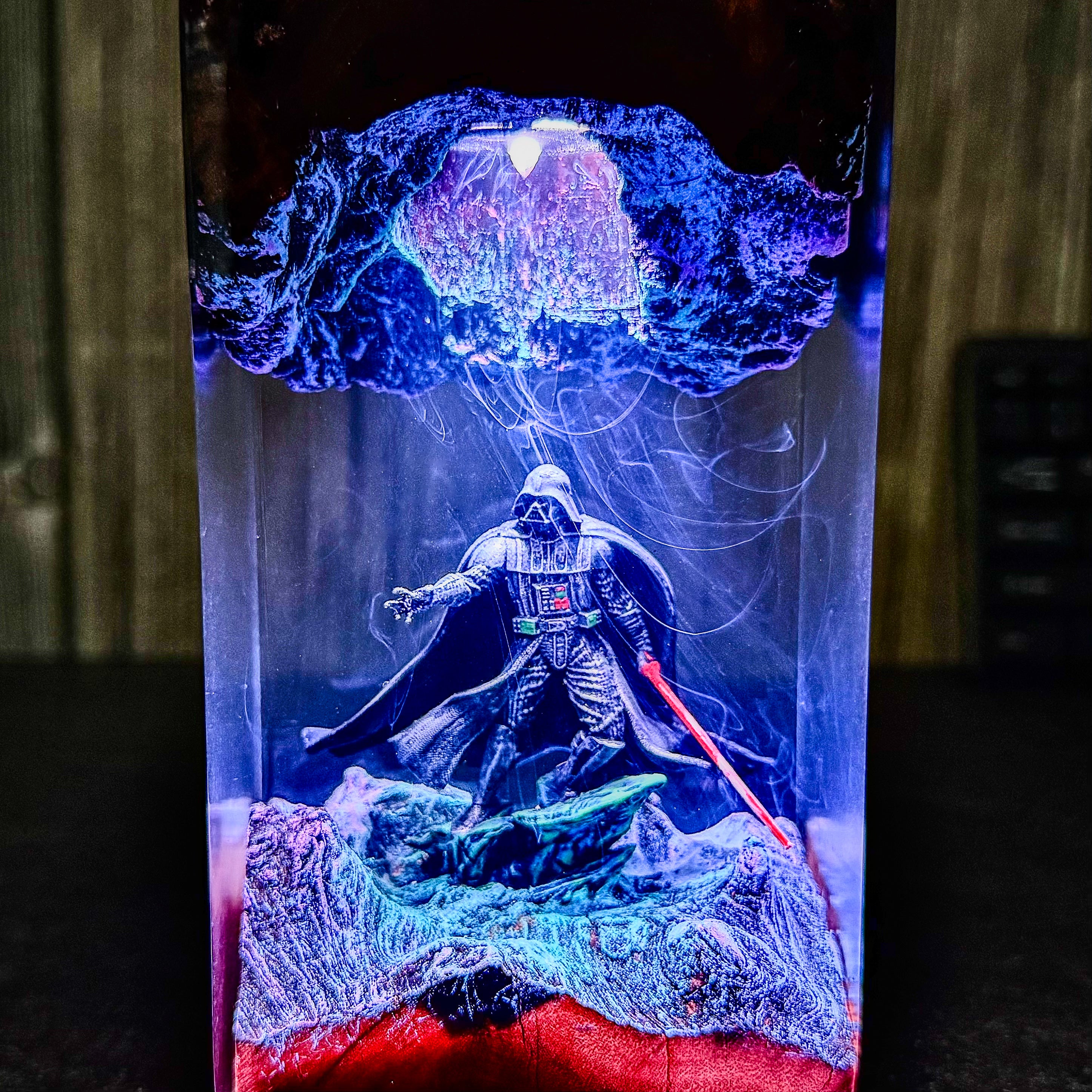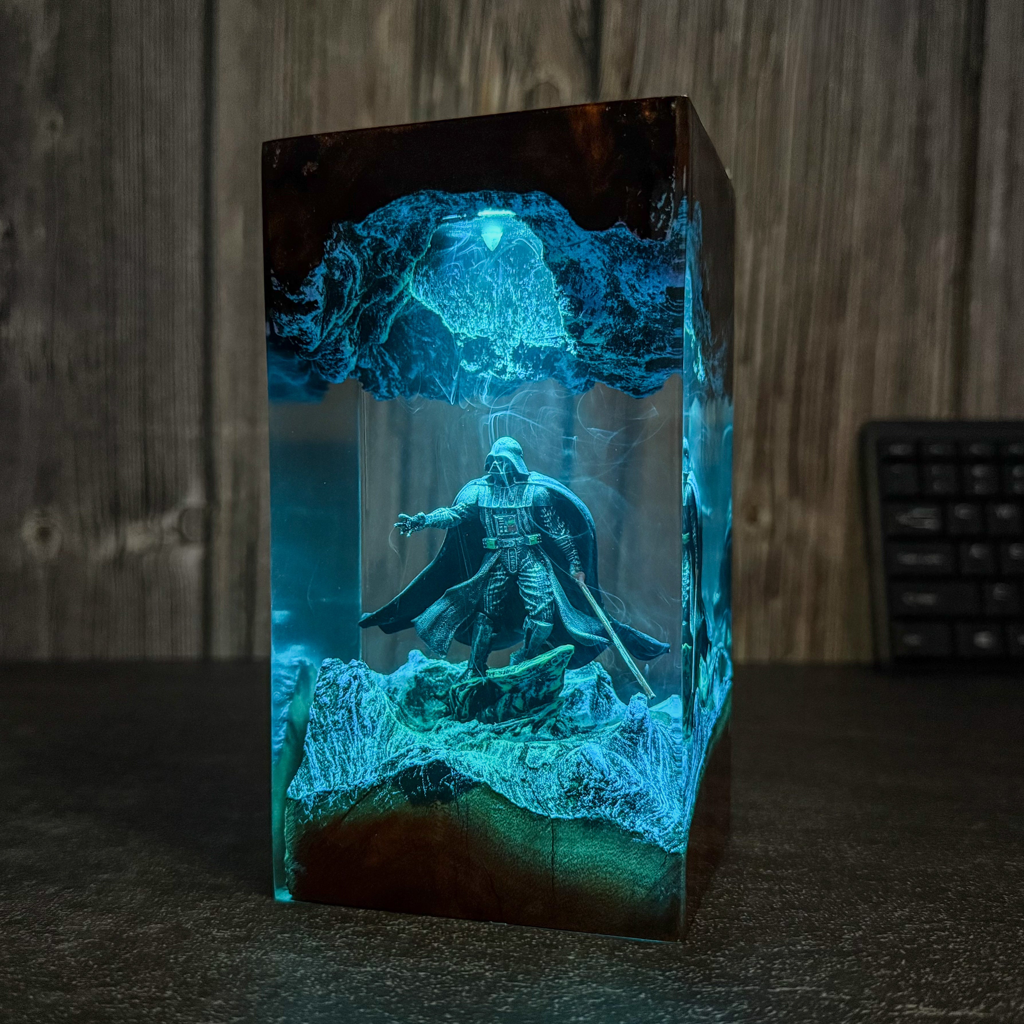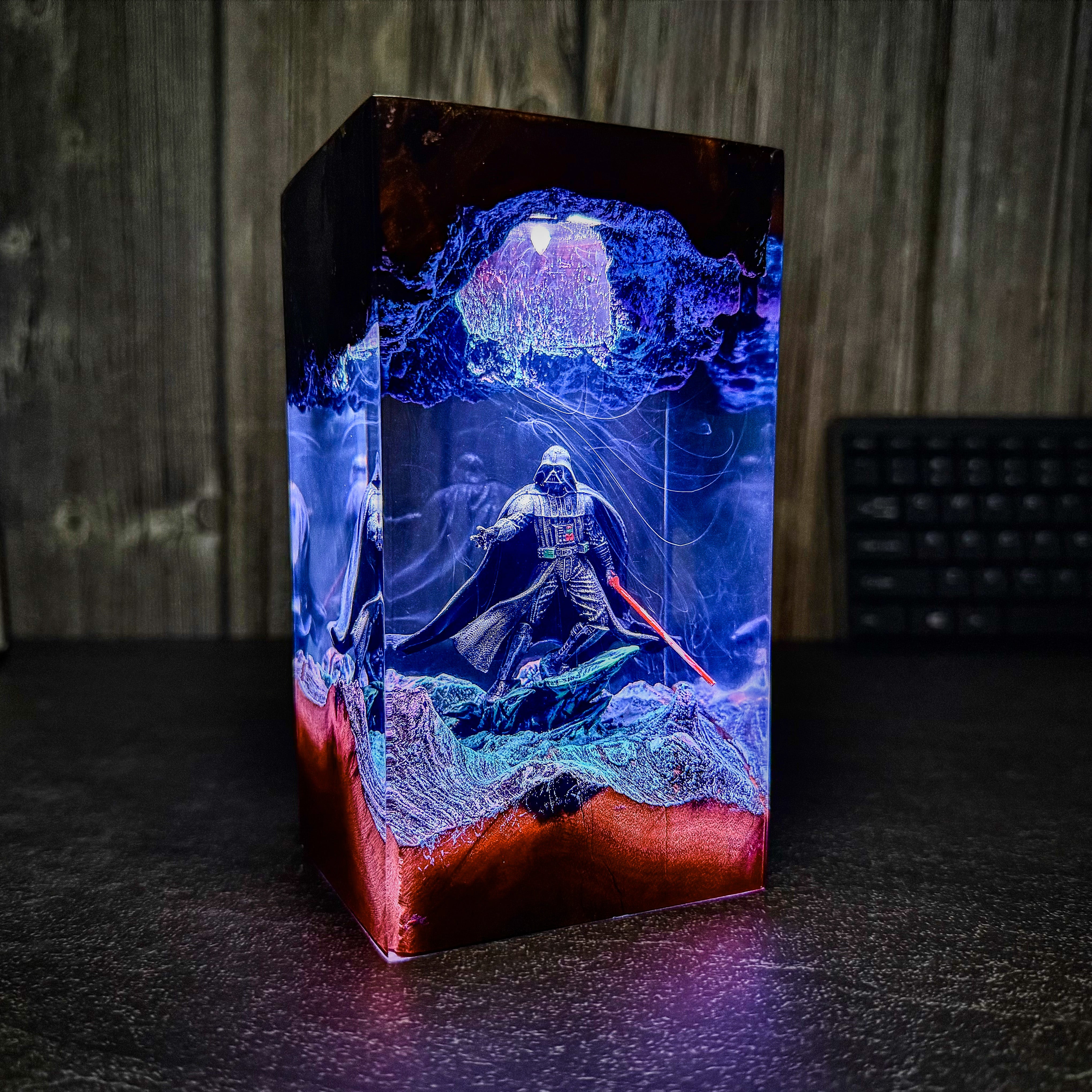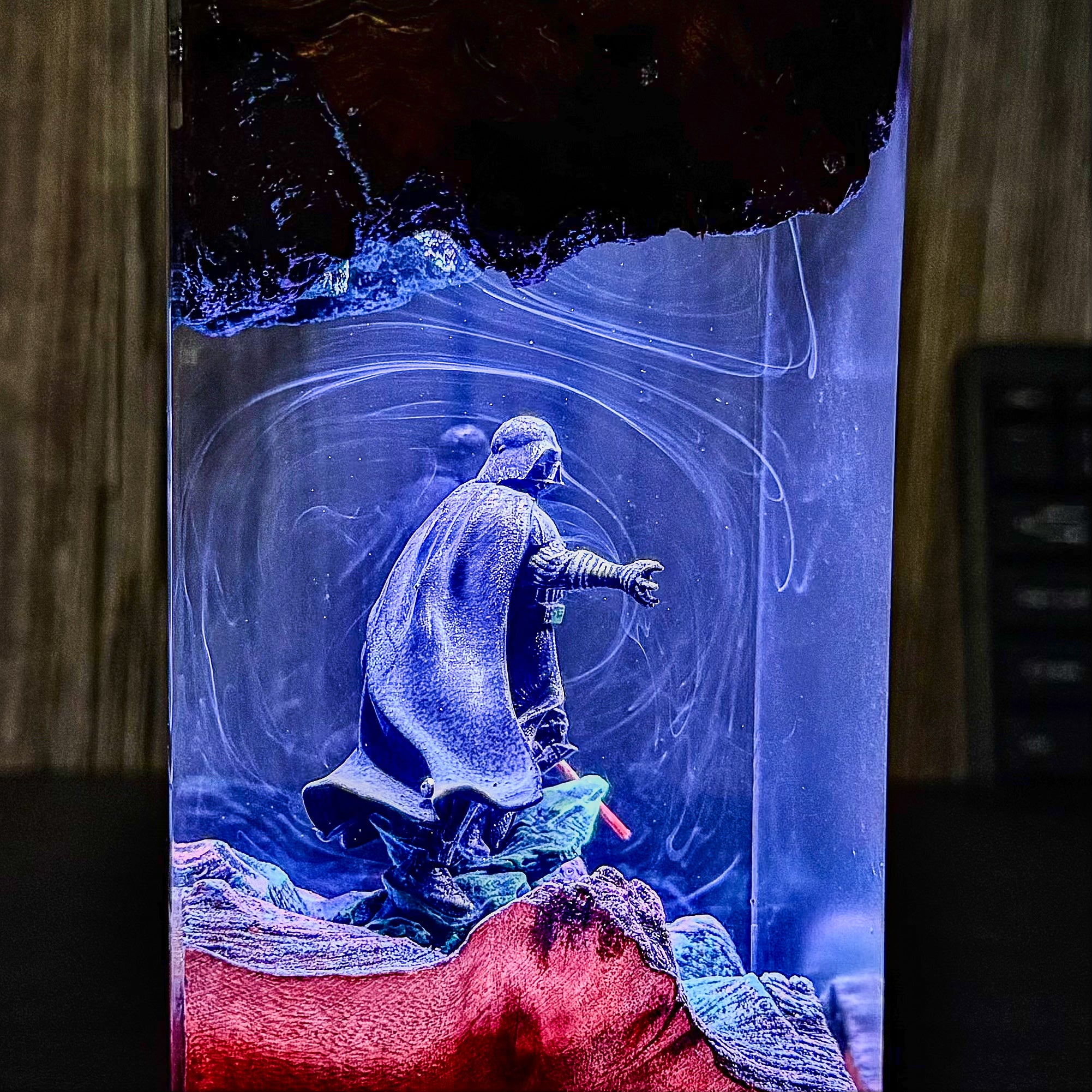 * Transform your space with this stunning DARTH VADER Starwar Epoxy Resin Lamp, Resin Wood Lamp. This meticulously crafted miniature captures an iconic moment, with detailed characters illuminated by built-in lights that create a surreal atmosphere. The combination of wood and resin brings depth and dimension to the scene, while the subtle blue glow adds a mystical quality to the display. Perfect as a nightlight or decorative accent, this unique piece seamlessly blends craftsmanship with fan appreciation. Each lamp is a unique work of art that serves as both a functional light source and a striking display piece that celebrates this beloved brand.