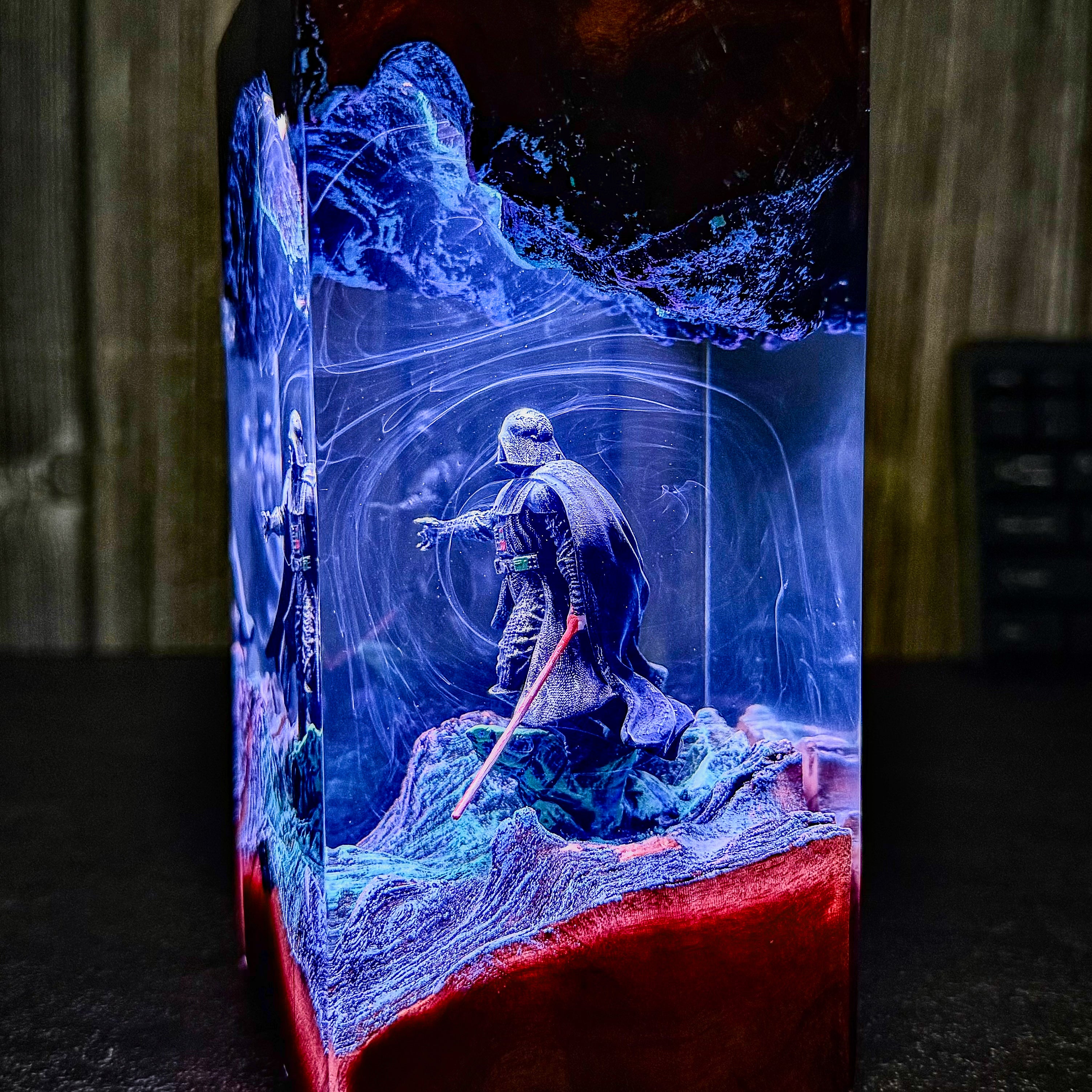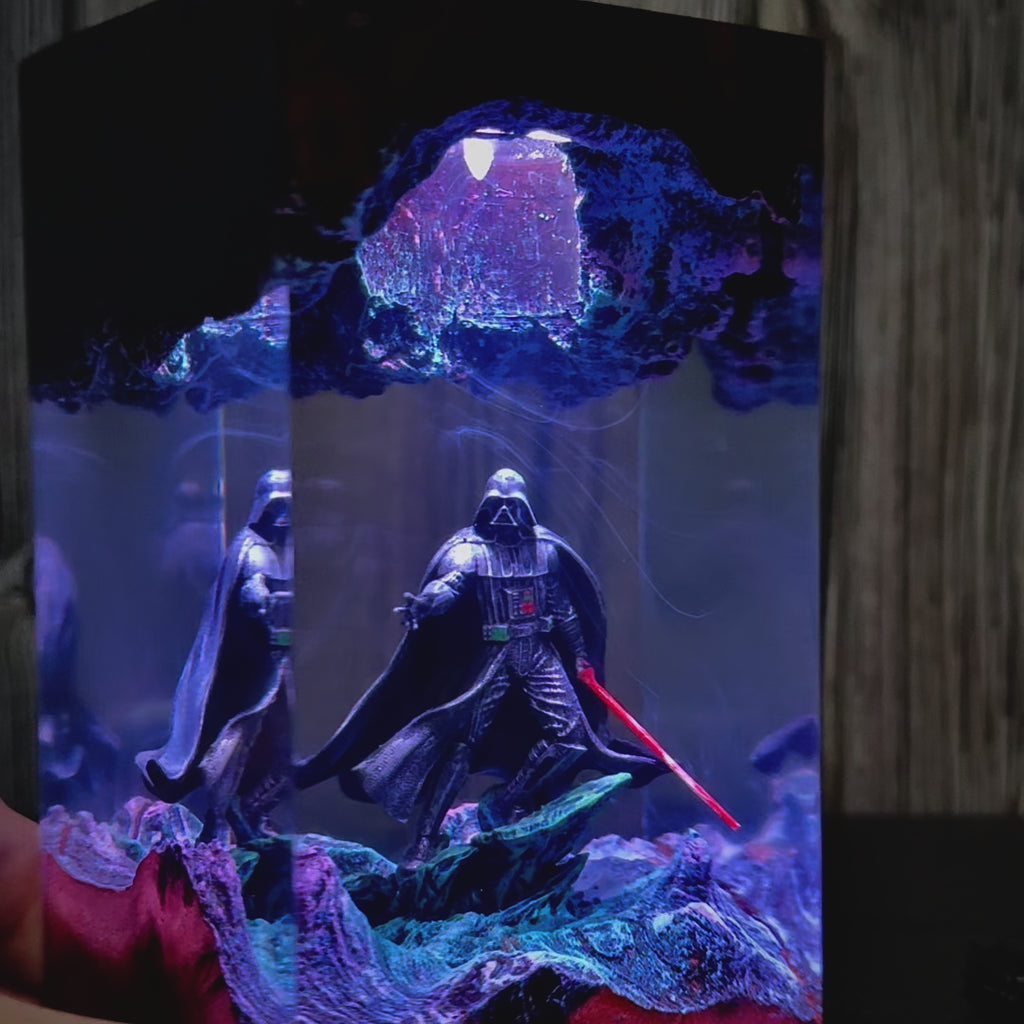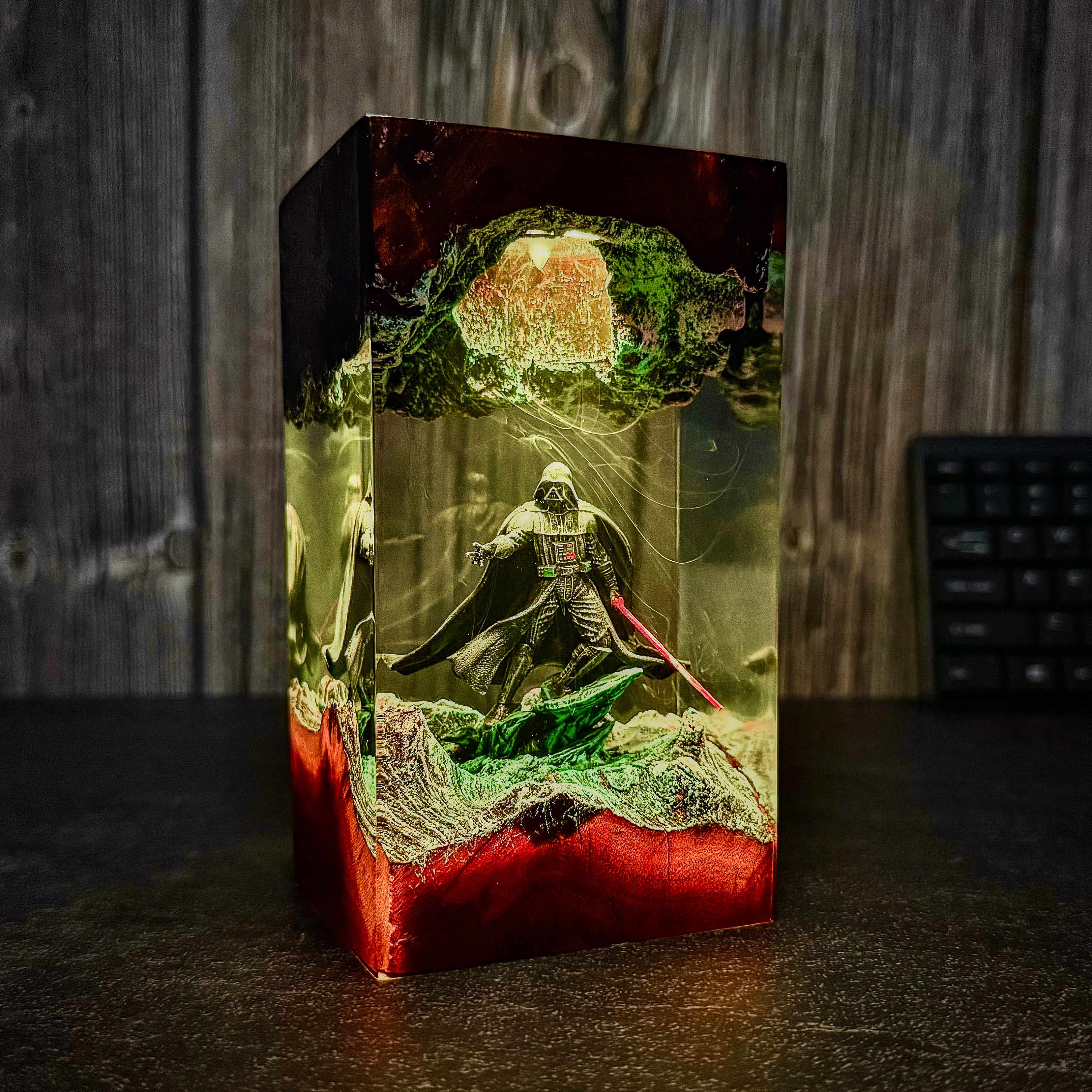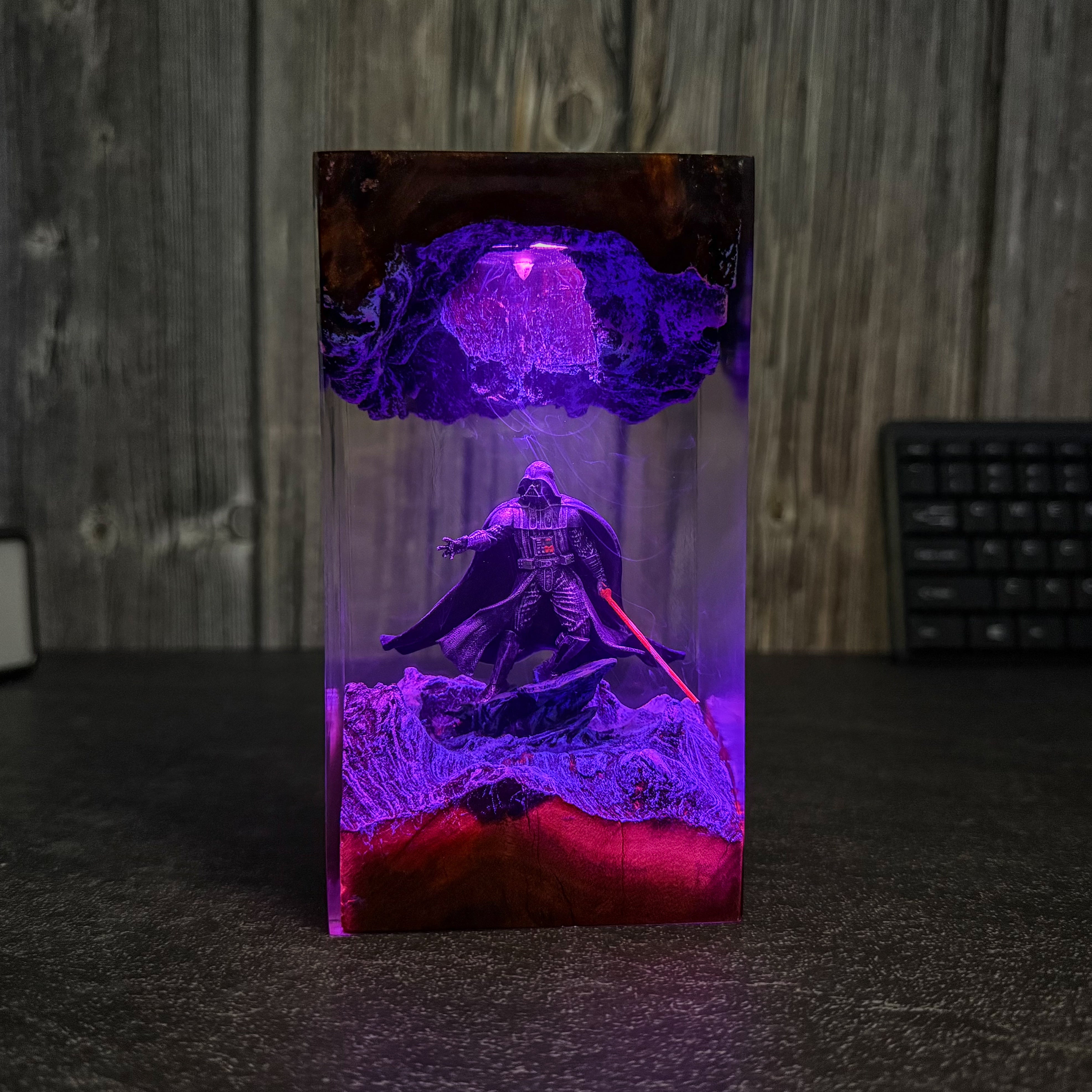 * Transform your space with this stunning DARTH VADER Starwar Epoxy Resin Lamp, Resin Wood Lamp. This meticulously crafted miniature captures an iconic moment, with detailed characters illuminated by built-in lights that create a surreal atmosphere. The combination of wood and resin brings depth and dimension to the scene, while the subtle blue glow adds a mystical quality to the display. Perfect as a nightlight or decorative accent, this unique piece seamlessly blends craftsmanship with fan appreciation. Each lamp is a unique work of art that serves as both a functional light source and a striking display piece that celebrates this beloved brand.