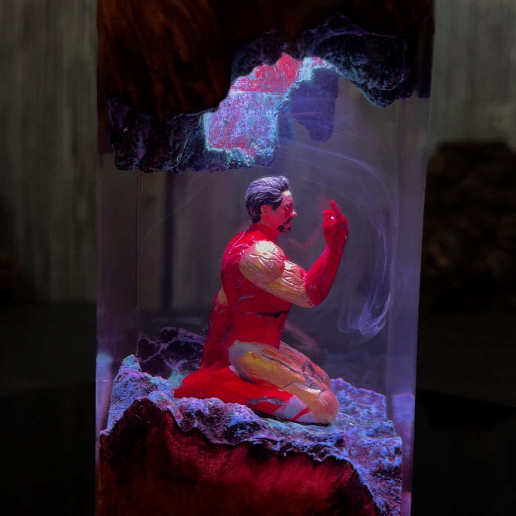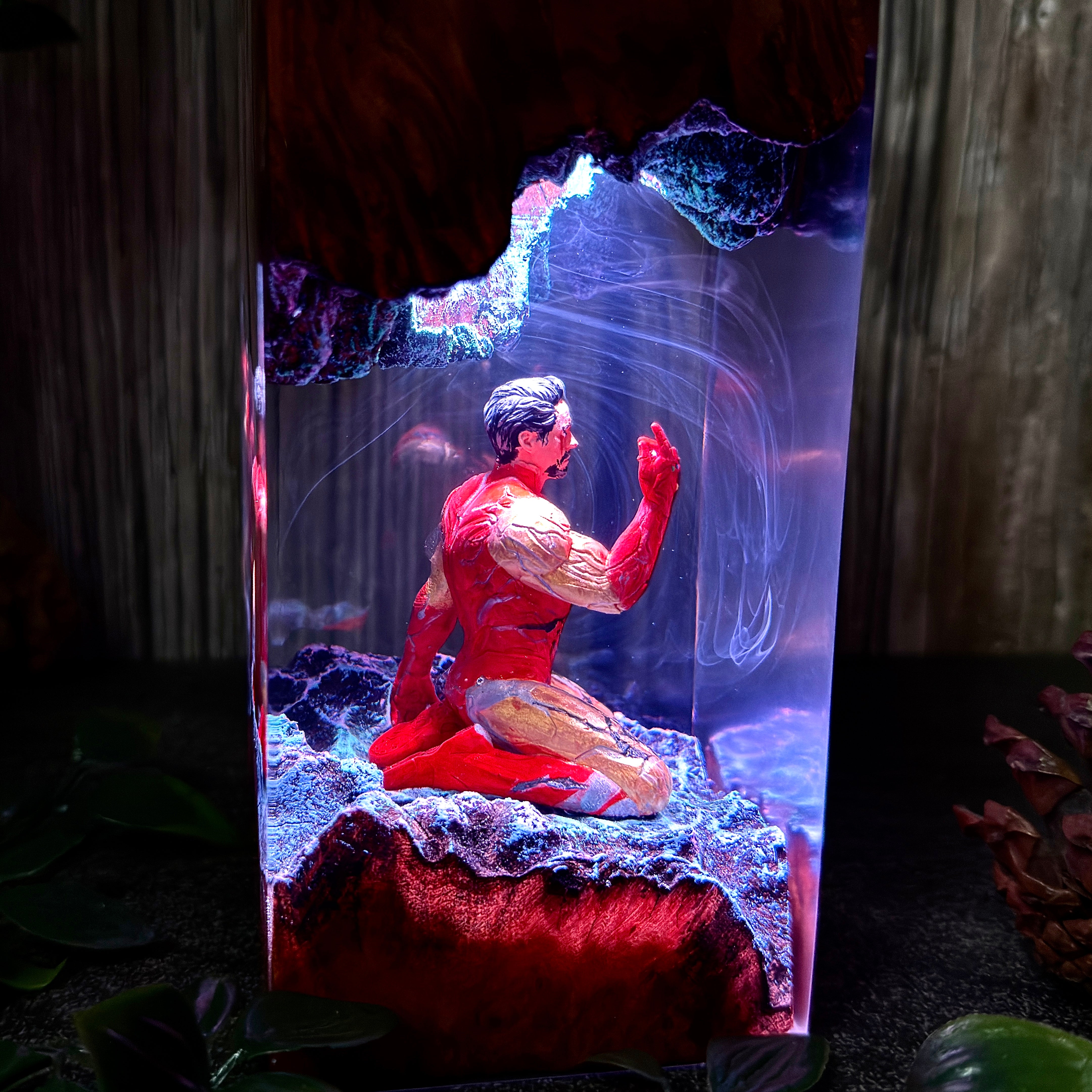 * Transform your space with this stunning Iron Man Epoxy Resin Lamp, Resin Wood Lamp. This meticulously crafted miniature captures an iconic moment, with detailed characters illuminated by built-in lights that create a surreal atmosphere. The combination of wood and resin brings depth and dimension to the scene, while the subtle blue glow adds a mystical quality to the display. Perfect as a nightlight or decorative accent, this unique piece seamlessly blends craftsmanship with fan appreciation. Each lamp is a unique work of art that serves as both a functional light source and a striking display piece that celebrates this beloved brand.