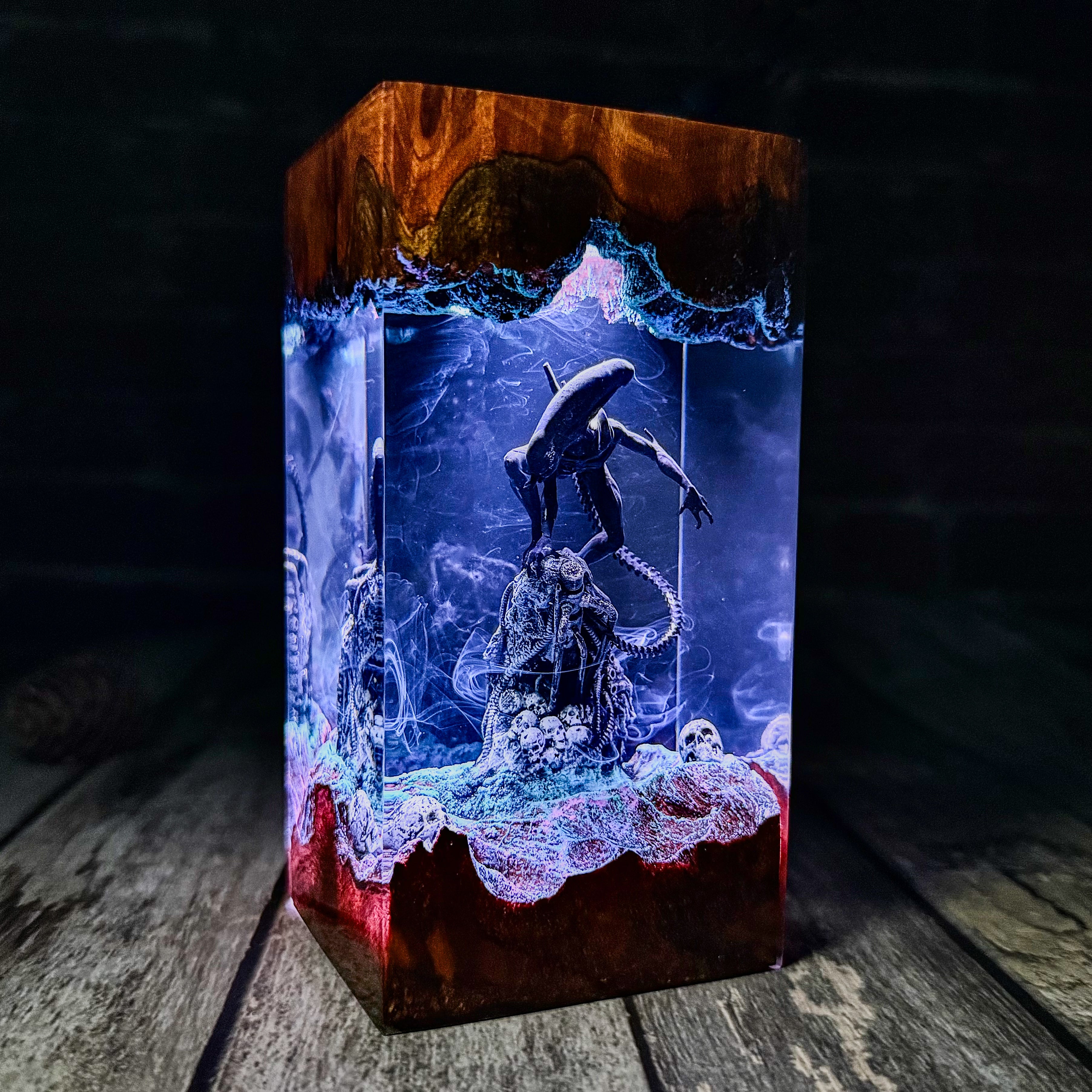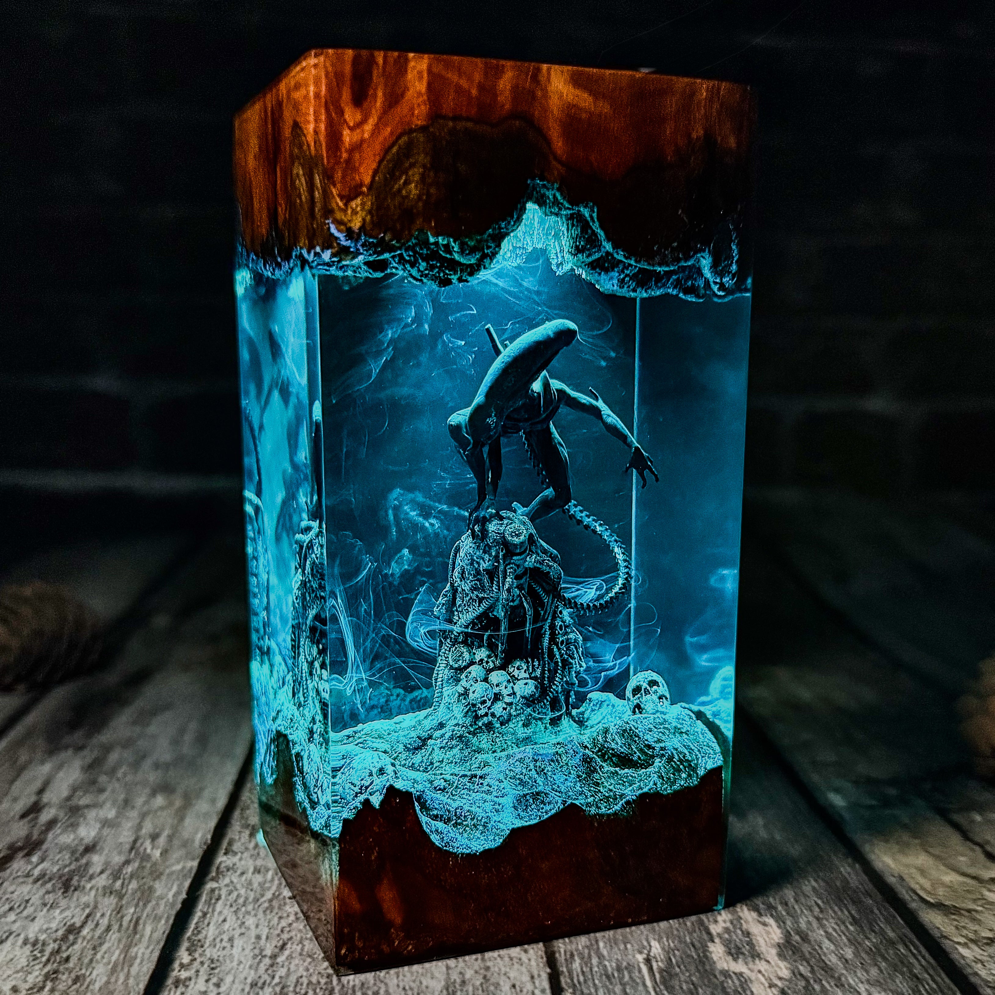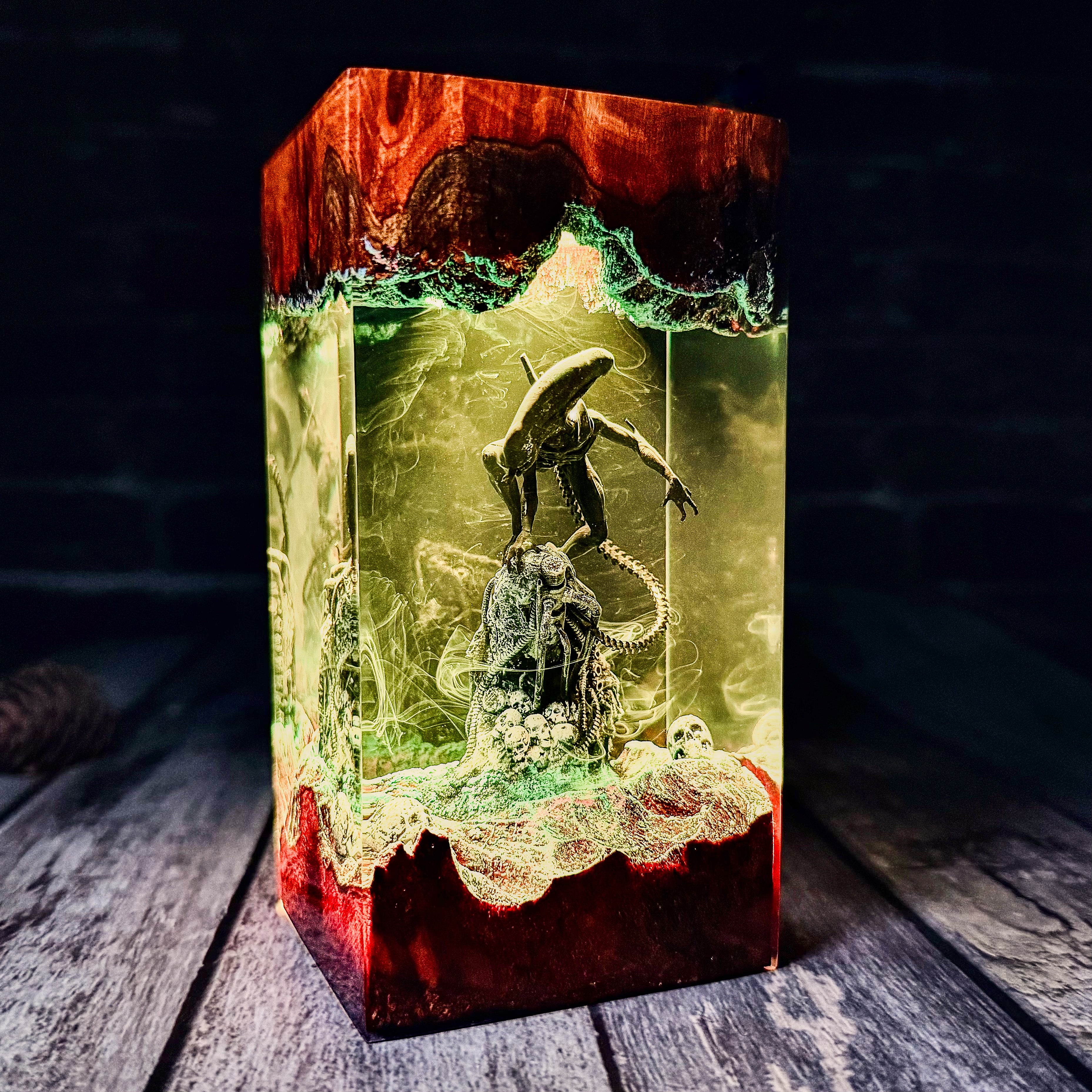 * Transform your space with this stunning ALIEN Epoxy Resin Lamp, Resin Wood Lamp. This meticulously crafted miniature captures an iconic moment, with detailed characters illuminated by built-in lights that create a surreal atmosphere. The combination of wood and resin brings depth and dimension to the scene, while the subtle blue glow adds a mystical quality to the display. Perfect as a nightlight or decorative accent, this unique piece seamlessly blends craftsmanship with fan appreciation. Each lamp is a unique work of art that serves as both a functional light source and a striking display piece that celebrates this beloved brand.
