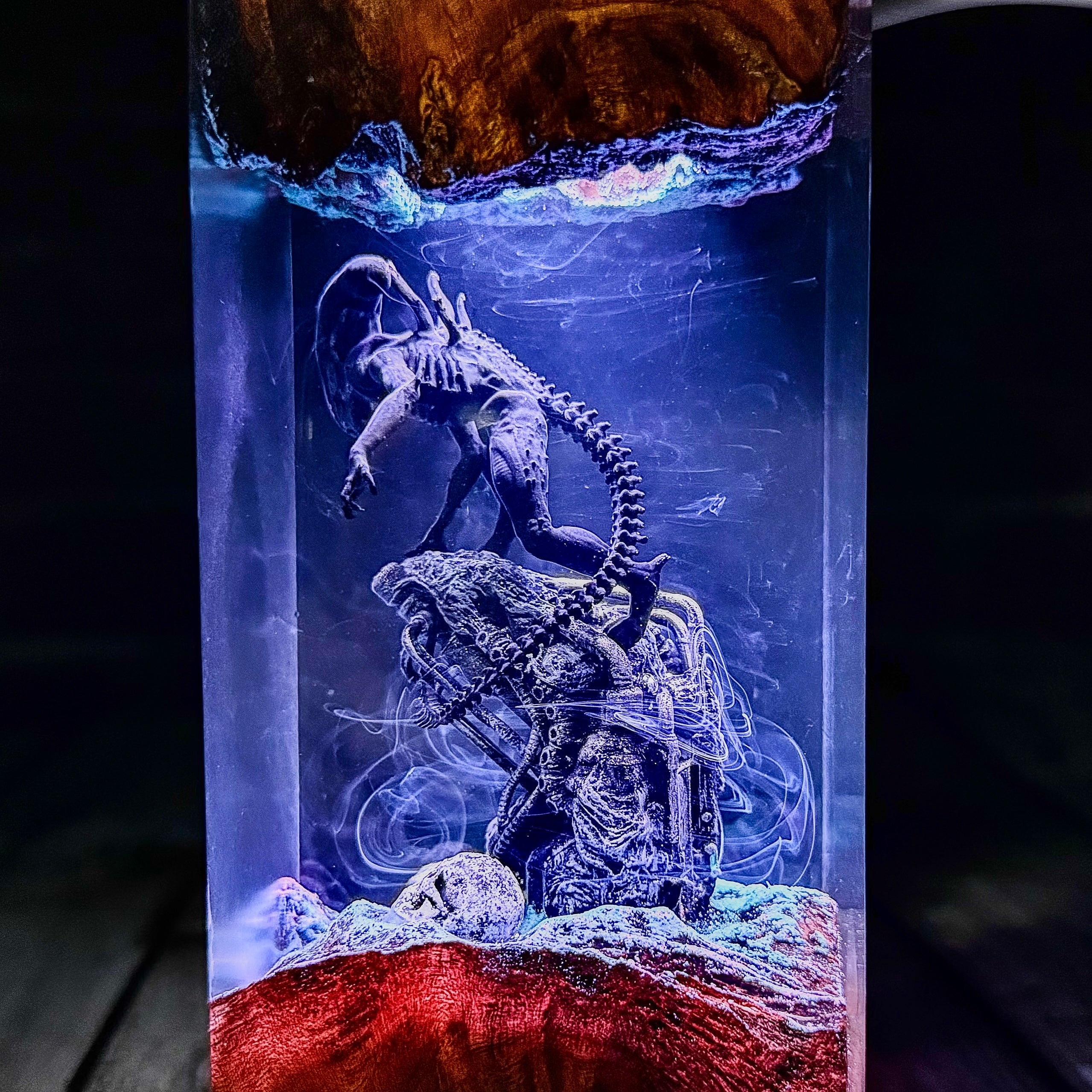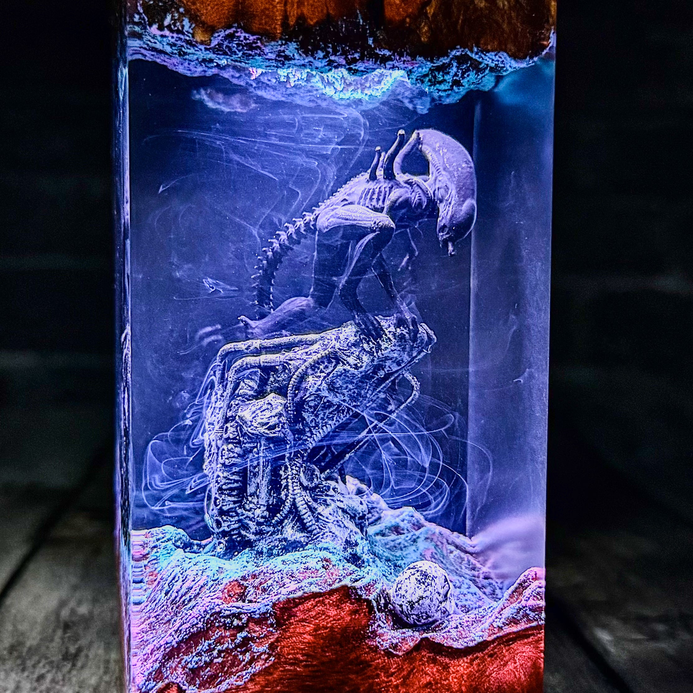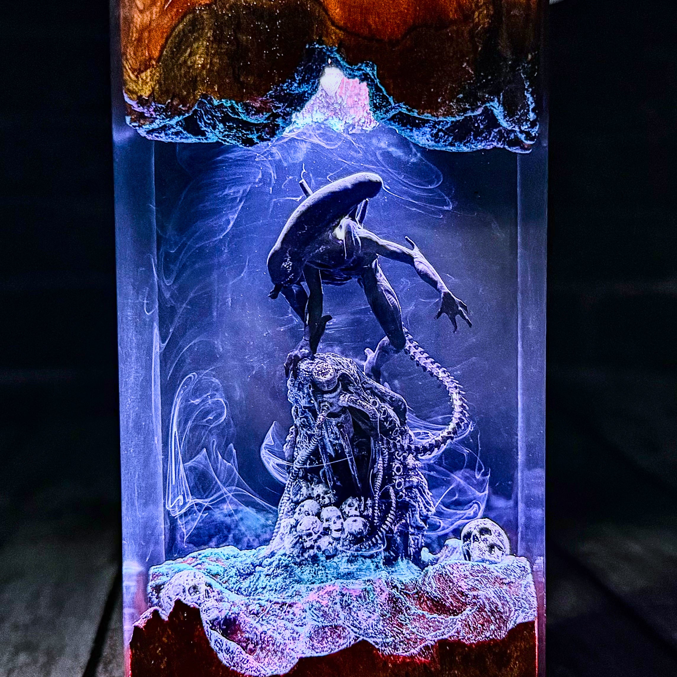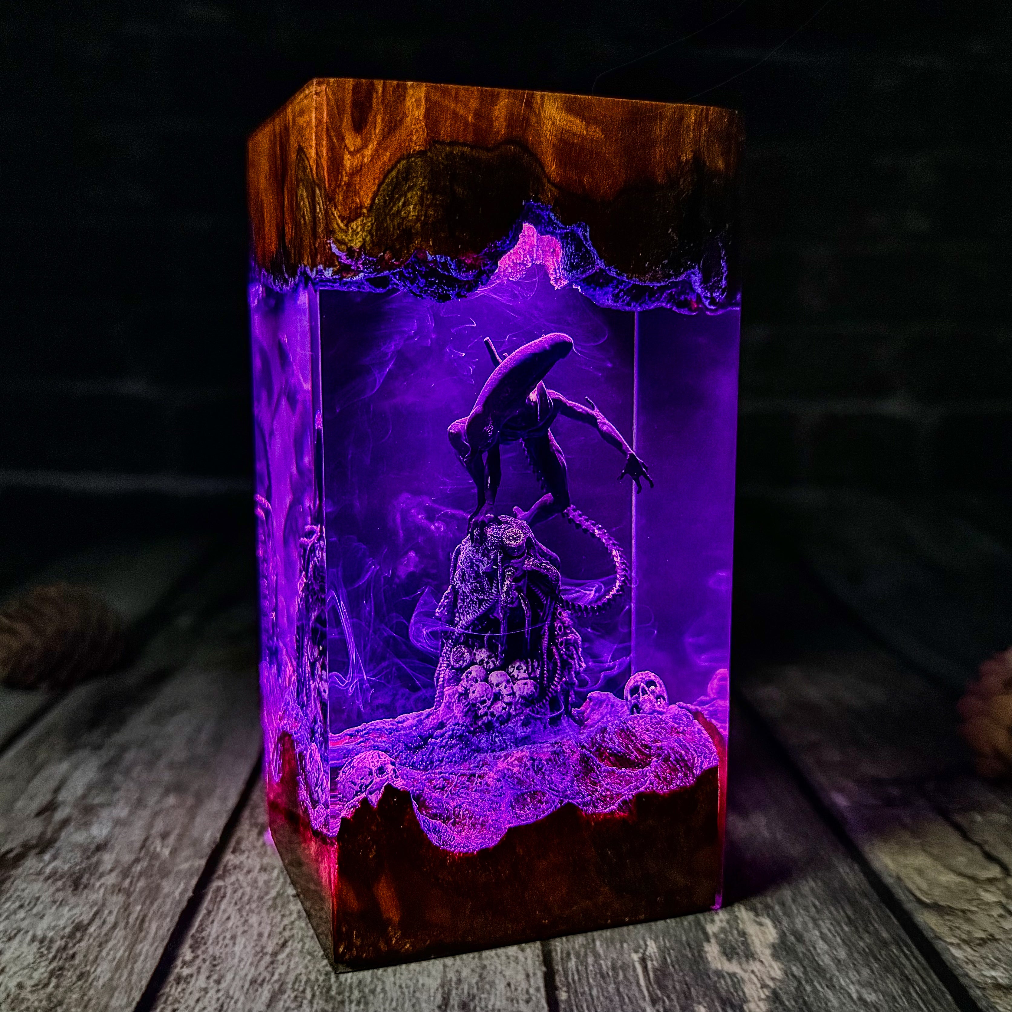 * Transform your space with this stunning ALIEN Epoxy Resin Lamp, Resin Wood Lamp. This meticulously crafted miniature captures an iconic moment, with detailed characters illuminated by built-in lights that create a surreal atmosphere. The combination of wood and resin brings depth and dimension to the scene, while the subtle blue glow adds a mystical quality to the display. Perfect as a nightlight or decorative accent, this unique piece seamlessly blends craftsmanship with fan appreciation. Each lamp is a unique work of art that serves as both a functional light source and a striking display piece that celebrates this beloved brand.