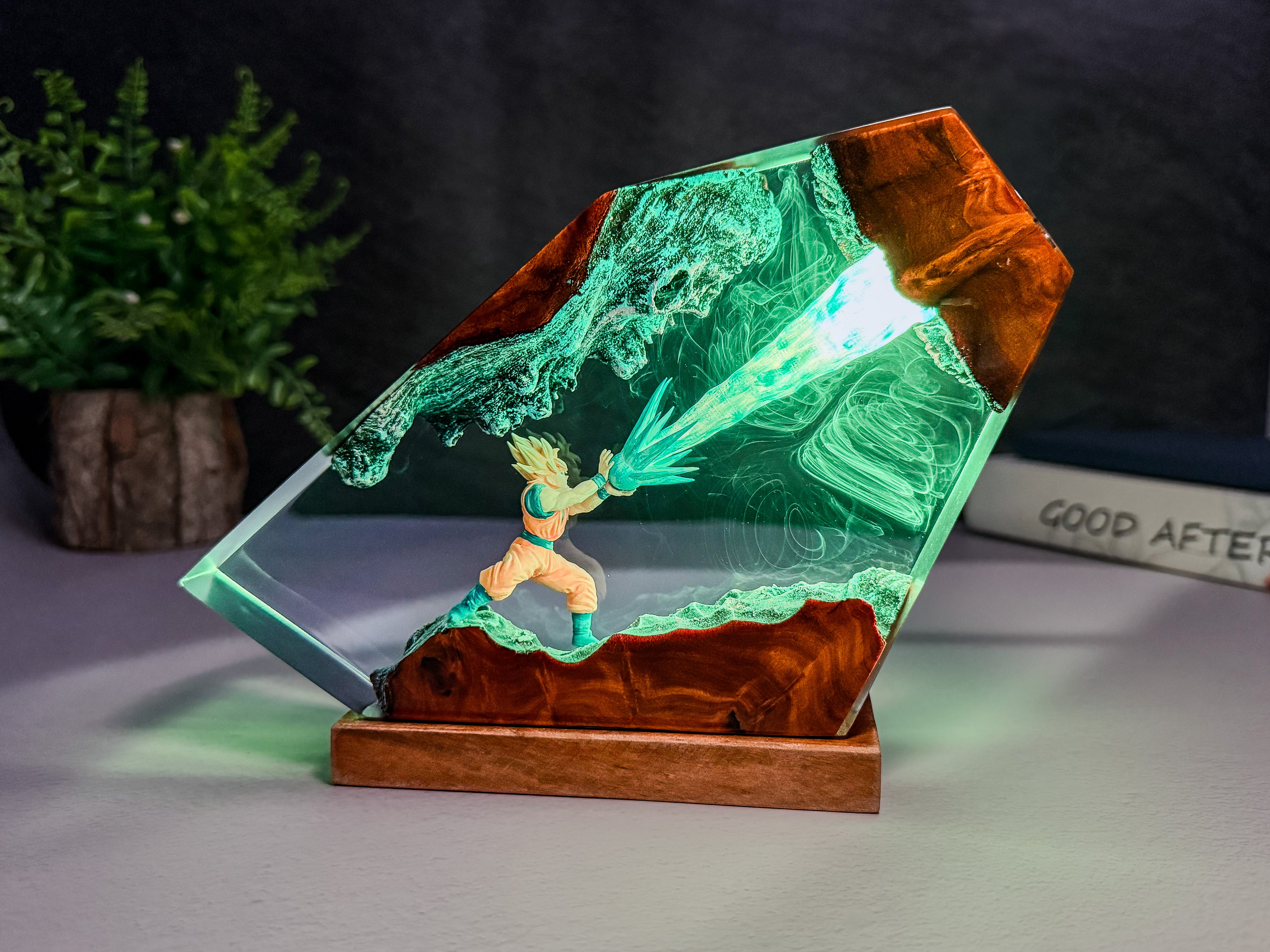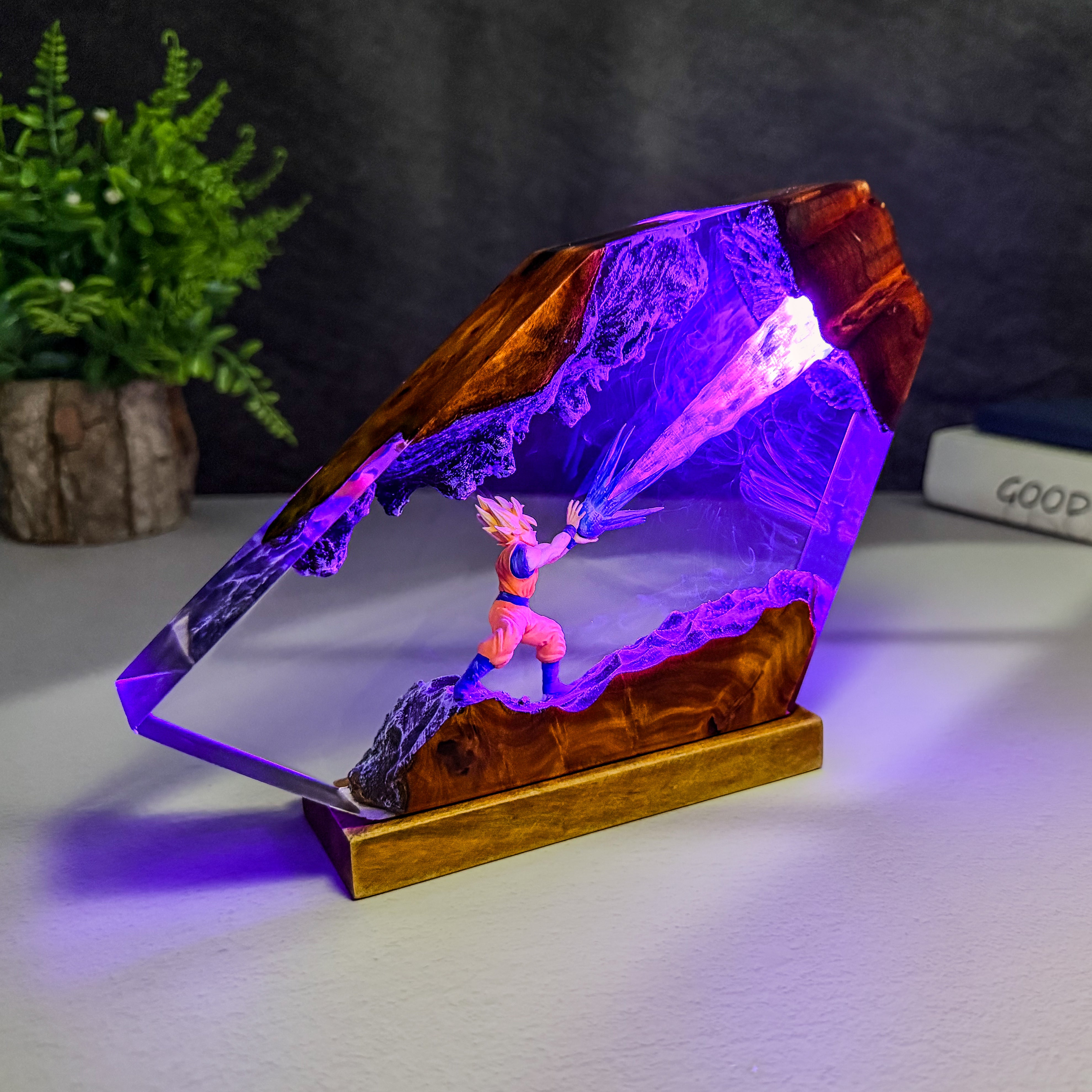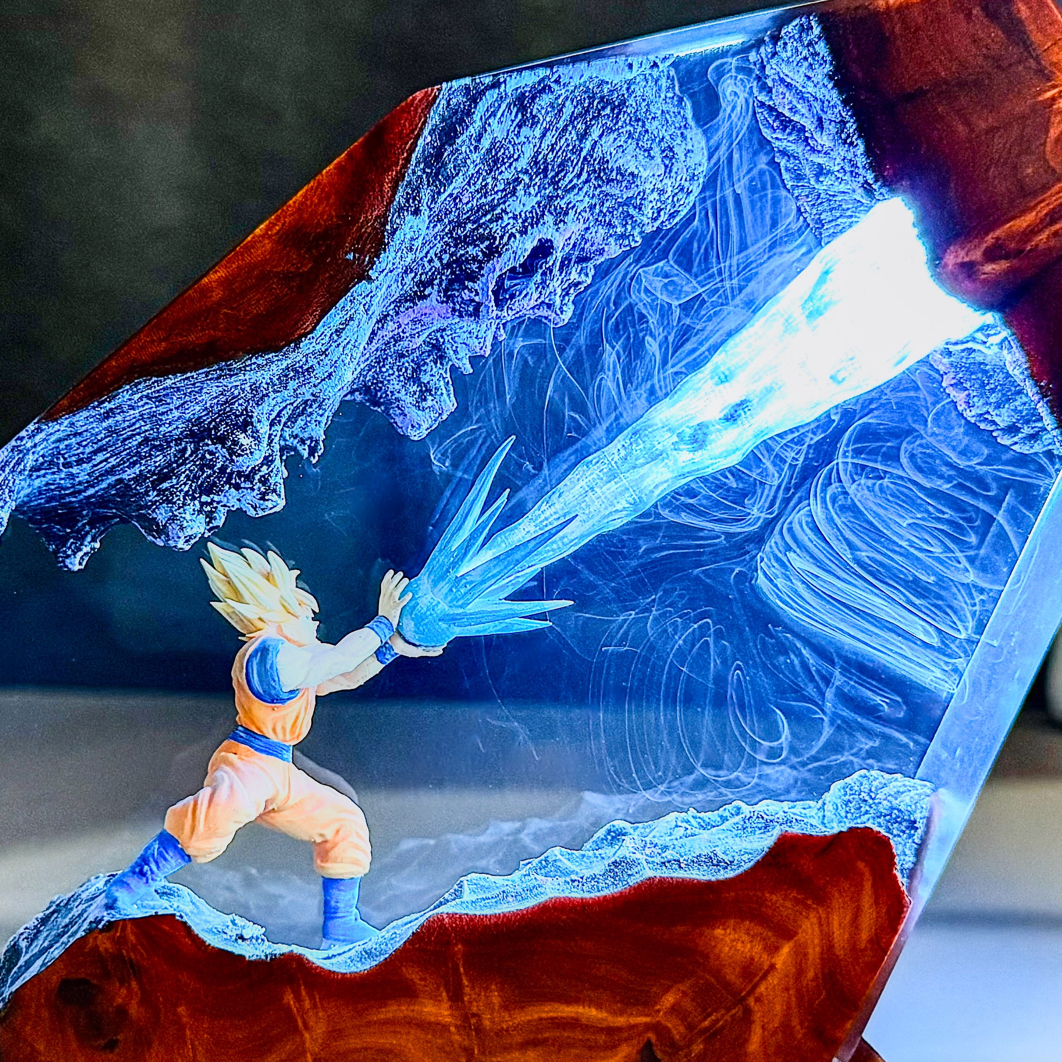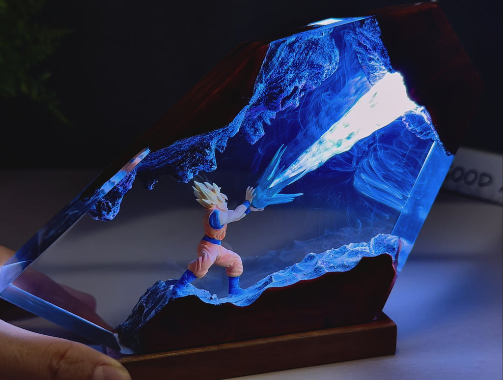 * Transform your space with this stunning Son Goku Dragon Ball Epoxy Resin Lamp, Resin Wood Lamp. This meticulously crafted miniature captures an iconic moment, with detailed characters illuminated by built-in lights that create a surreal atmosphere. The combination of wood and resin brings depth and dimension to the scene, while the subtle blue glow adds a mystical quality to the display. Perfect as a nightlight or decorative accent, this unique piece seamlessly blends craftsmanship with fan appreciation. Each lamp is a unique work of art that serves as both a functional light source and a striking display piece that celebrates this beloved brand.