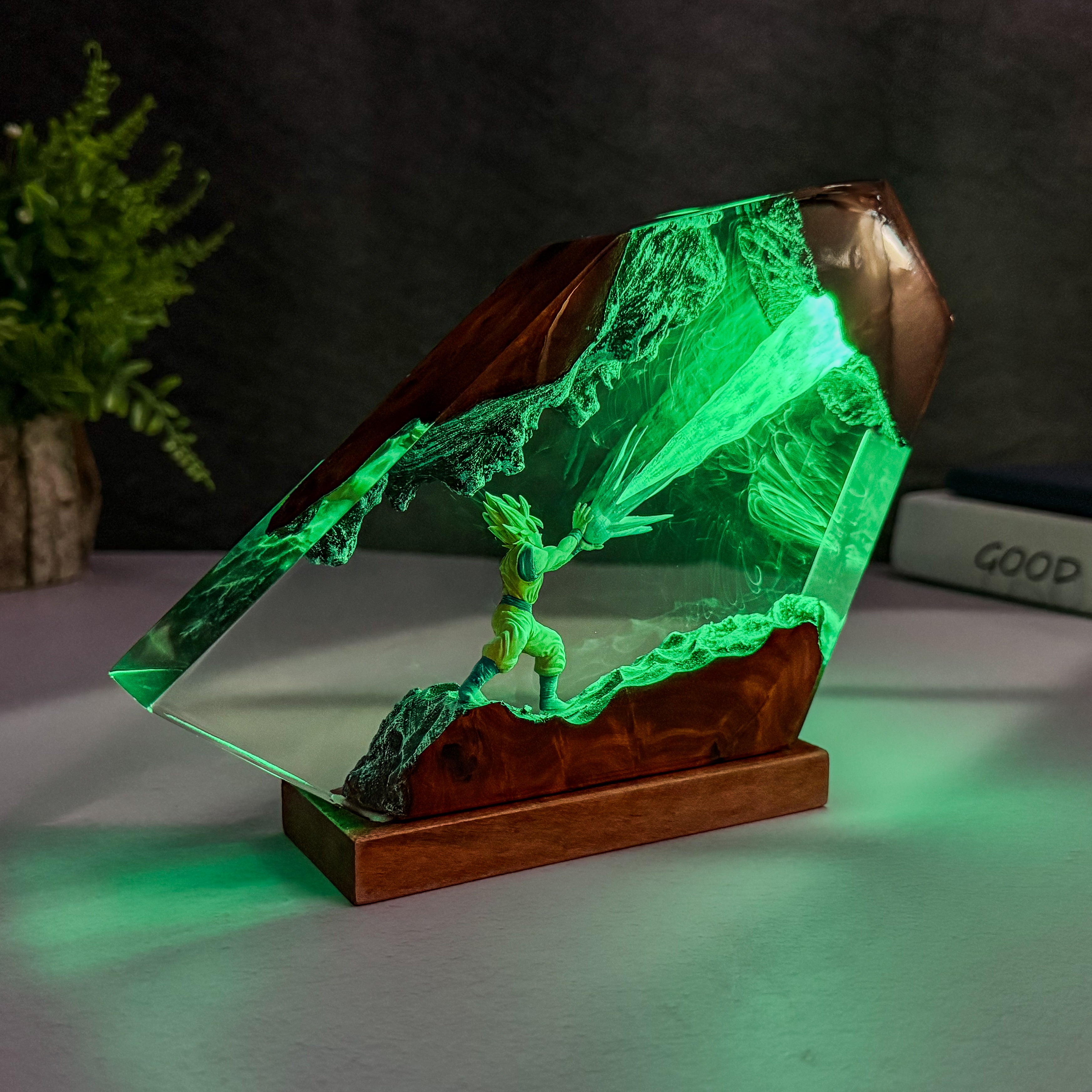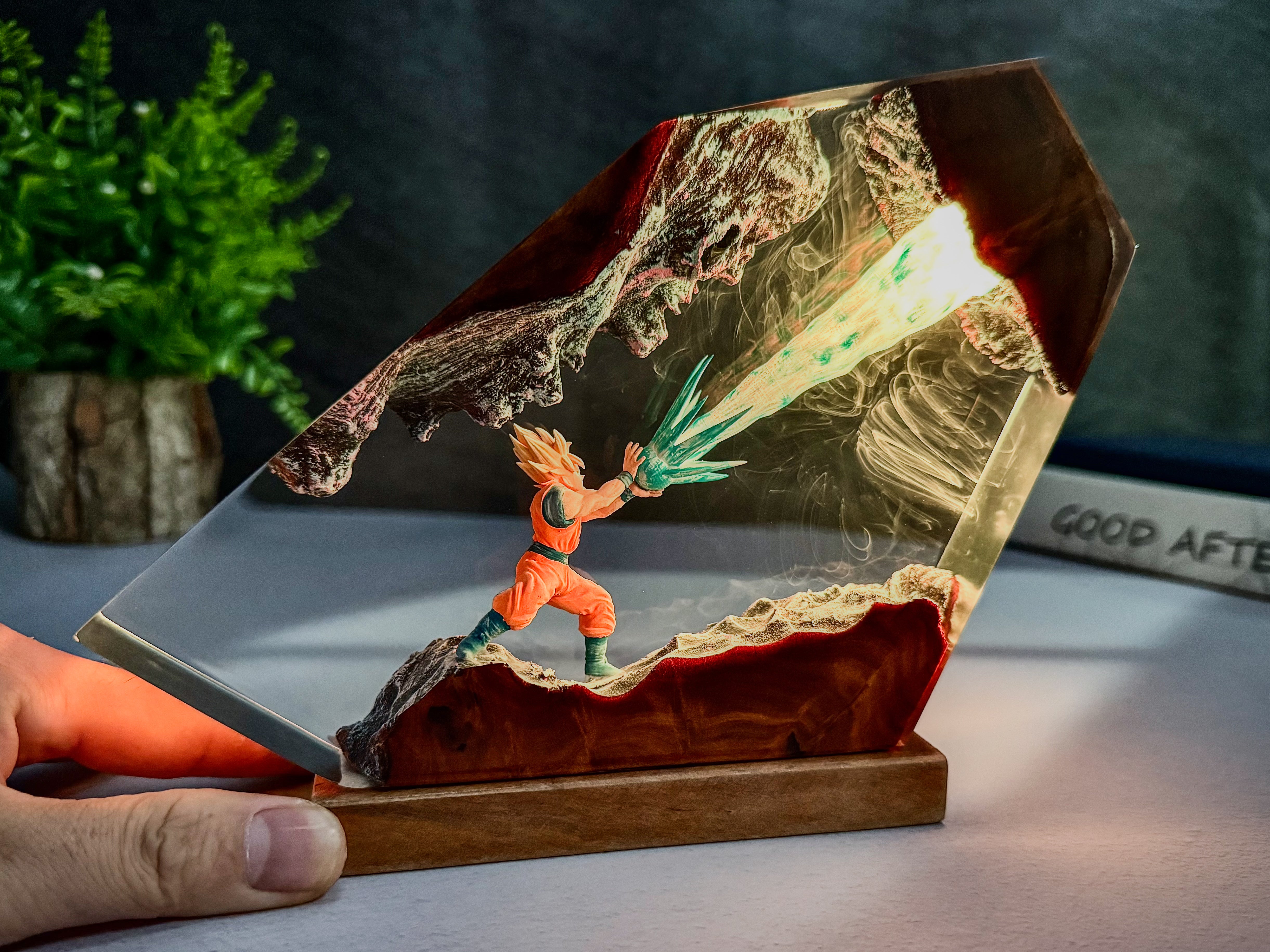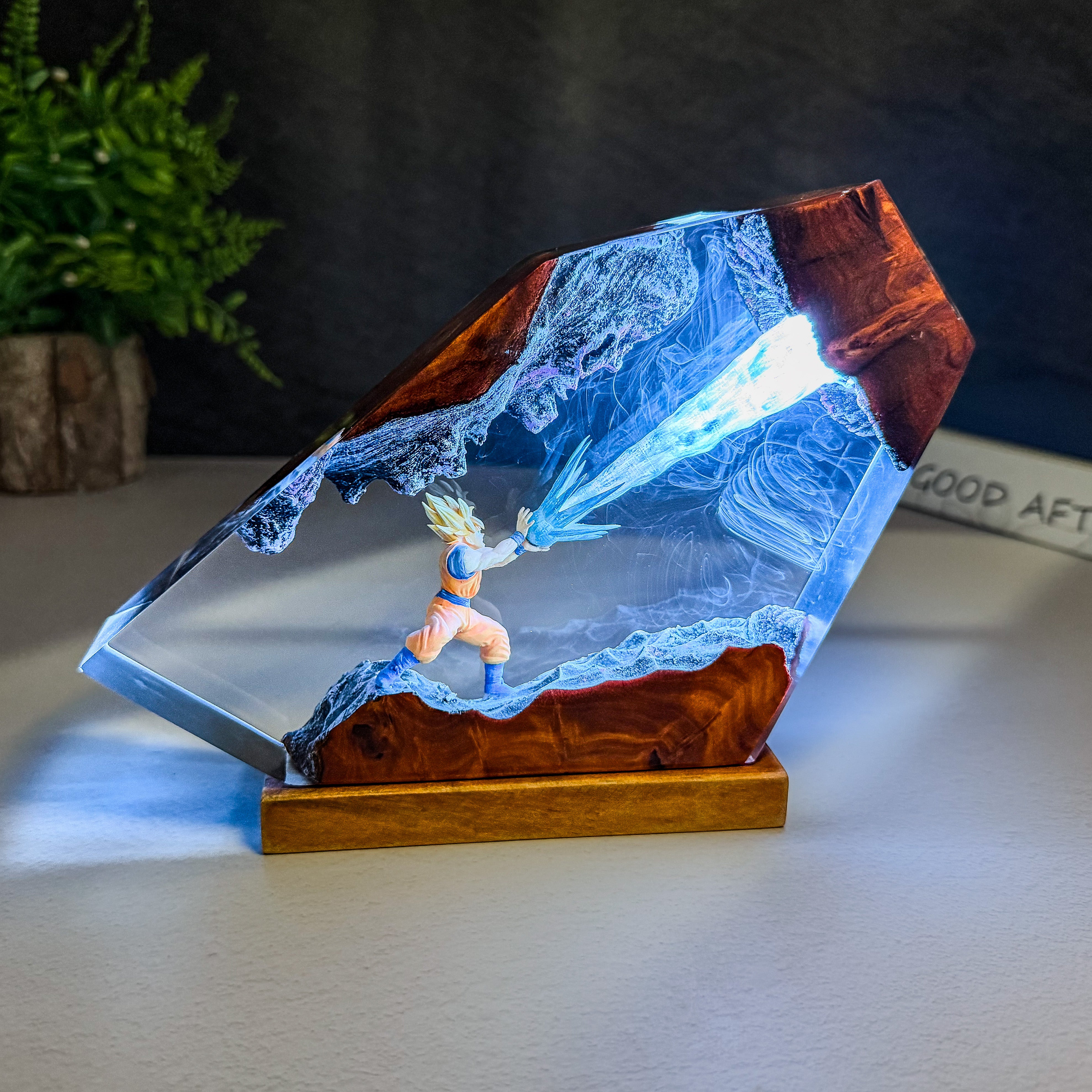 * Transform your space with this stunning Son Goku Dragon Ball Epoxy Resin Lamp, Resin Wood Lamp. This meticulously crafted miniature captures an iconic moment, with detailed characters illuminated by built-in lights that create a surreal atmosphere. The combination of wood and resin brings depth and dimension to the scene, while the subtle blue glow adds a mystical quality to the display. Perfect as a nightlight or decorative accent, this unique piece seamlessly blends craftsmanship with fan appreciation. Each lamp is a unique work of art that serves as both a functional light source and a striking display piece that celebrates this beloved brand.